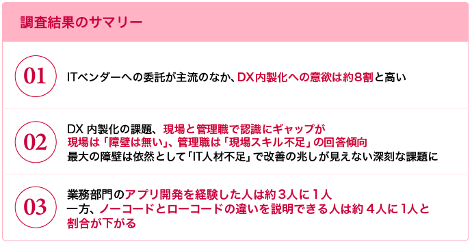こうしたなか、ドリーム・アーツでは企業の「DX内製化」に対する意欲、現状の課題、理想像、そして実際の取り組み状況を把握するため、従業員数1,000名以上の企業に所属する従業員650名を対象にインターネットによるアンケート調査を実施しました。