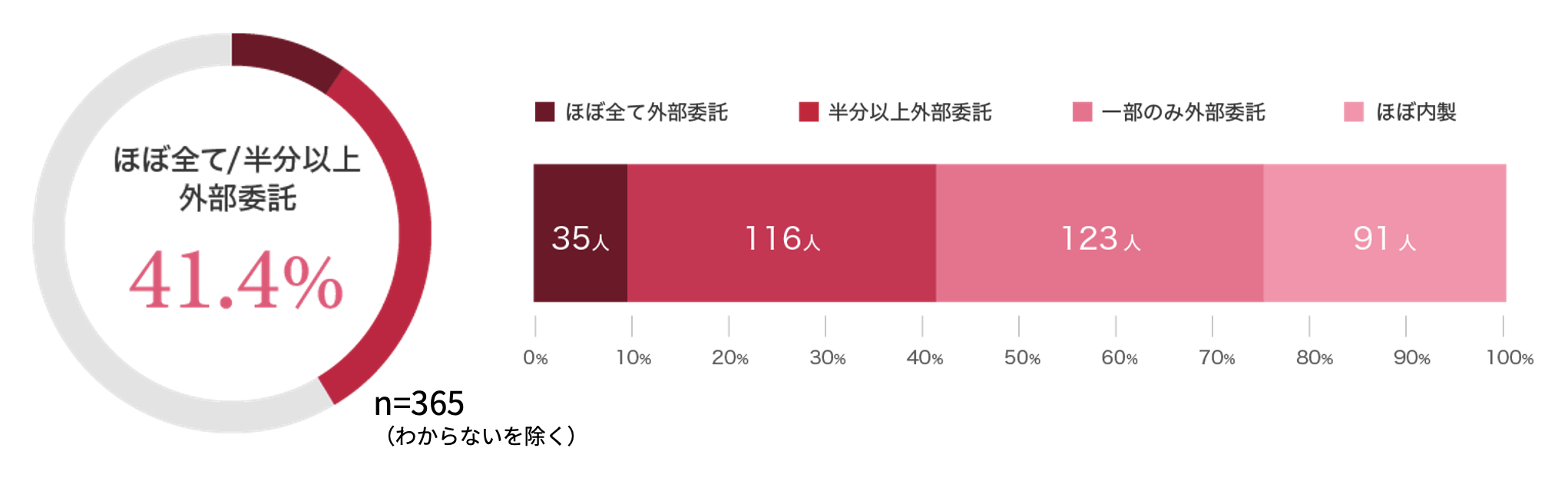 「外部ITベンダーへの委託状況」はどの程度かを聞いたところ、「ほぼ全て外部委託」と「半分以上外部委託」を合わせると41.4%と外部に多くを委託している状況が明らかになりました。 「ほぼ内製」は24.9%と少ない状態です(グラフ1)。