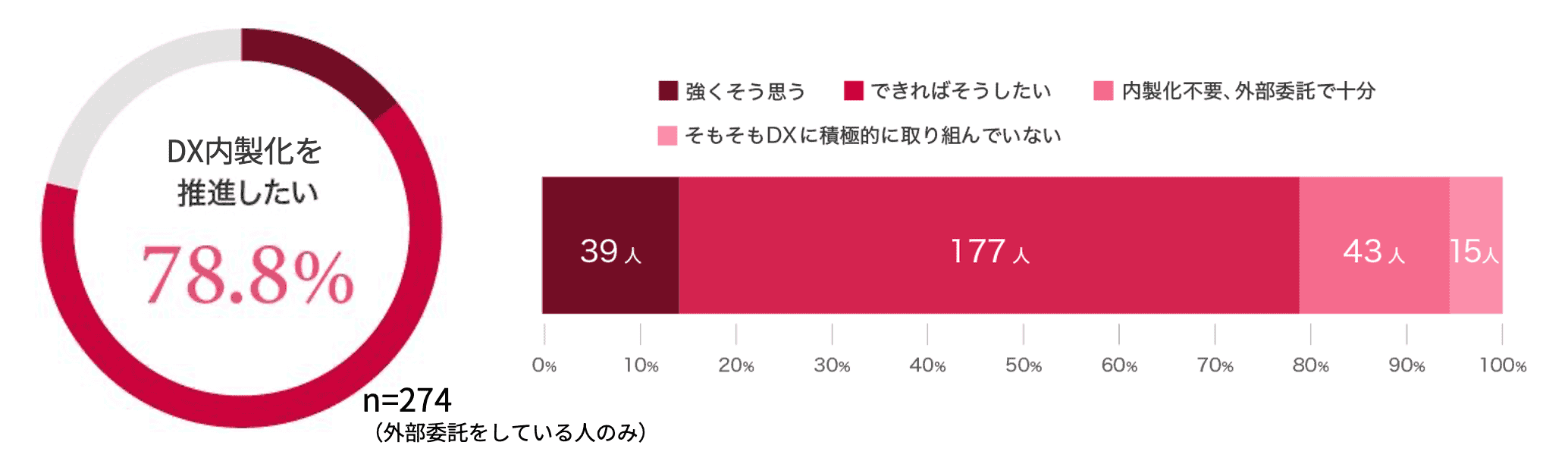 DXの内製化を推進したいか尋ねたところ、「強くそう思う」「できればそうしたい」と回答した人は約8割(78.8%)にのぼり、大企業における内製化への高い意欲が明らかになりました(グラフ2)。