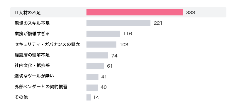 DX内製化の最大の障壁は「IT人材不足」の回答が最も多い結果となりました(グラフ3)。 ここ数年「IT人材不足」が課題として叫ばれ続けていますが状況は大きく改善されておらず、人材面の課題は依然として深刻なことが明確です。