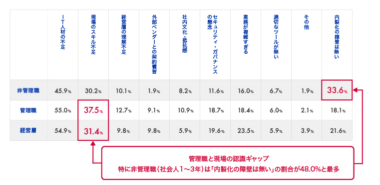 さらに今回の調査では、DX内製化の障壁の認識において、現場と管理職の間でギャップがあることが明らかになりました。 「IT人材不足」に次ぐ課題を役職別で見ると、管理職・経営層は「現場のスキル不足(管理職:37.5%、経営層:31.4%)」とする一方で、現場レベルの非管理職は「障壁は無い(33.6%)」と回答し、両者の認識に差が見られました。